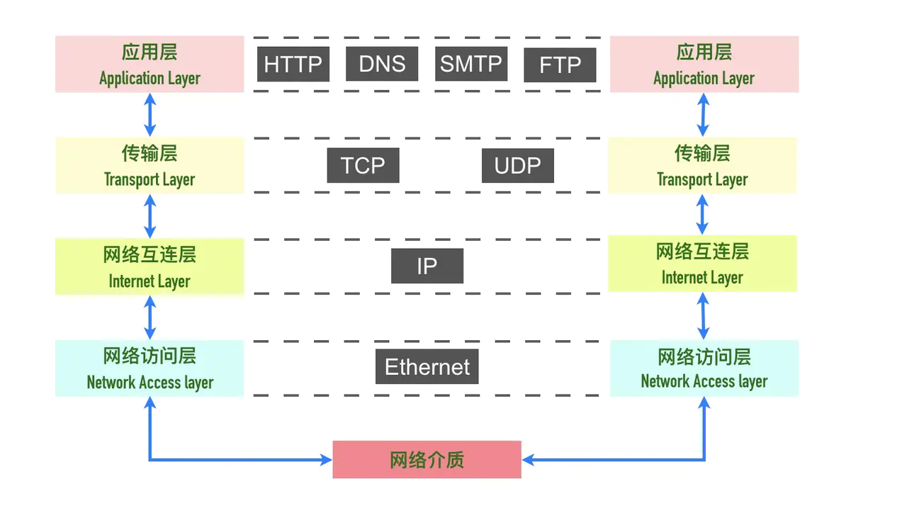 网络访问层也有说法叫做网络接口层,以太网、Wifi、蓝牙工作在这一层,网络访问层提供了主机连接到物理网络需要的硬件和相关的协议。这一层我们不做重点讨论。