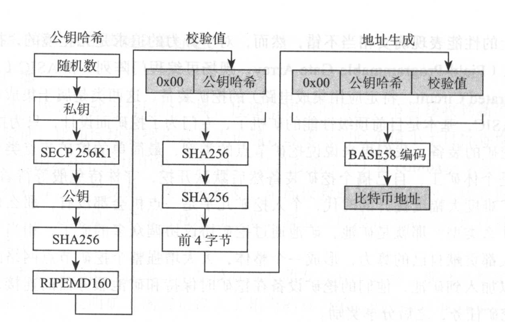 我们可以发现比特币的地址其实就是通过公钥转化而来的,将上图简化一下,就是下面这么一个过程:
