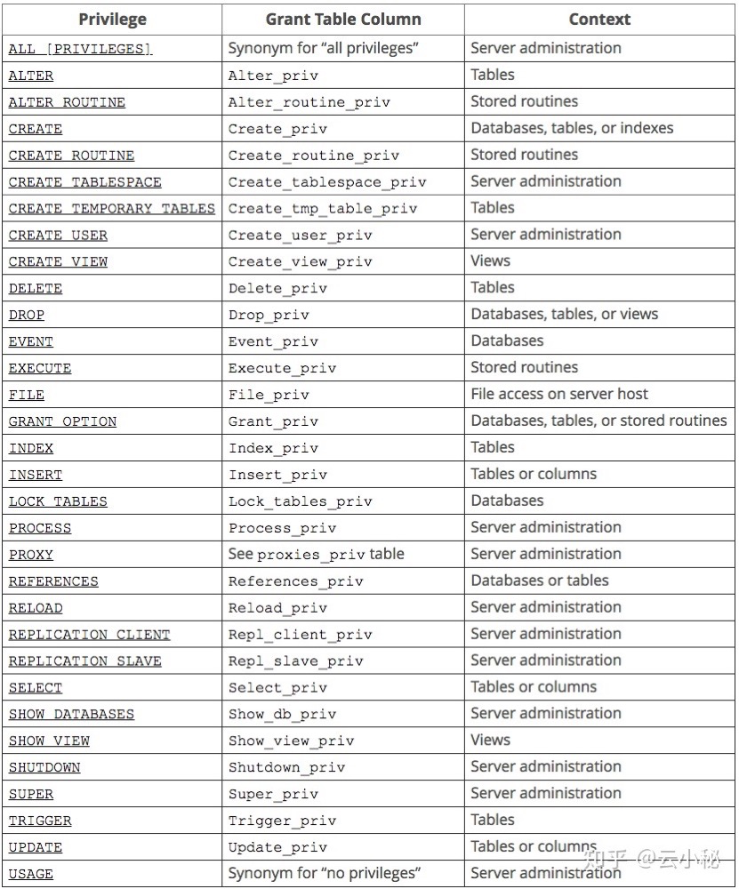 REVOKE SELECT ON test.* FROM tester; # 删除权限权限表